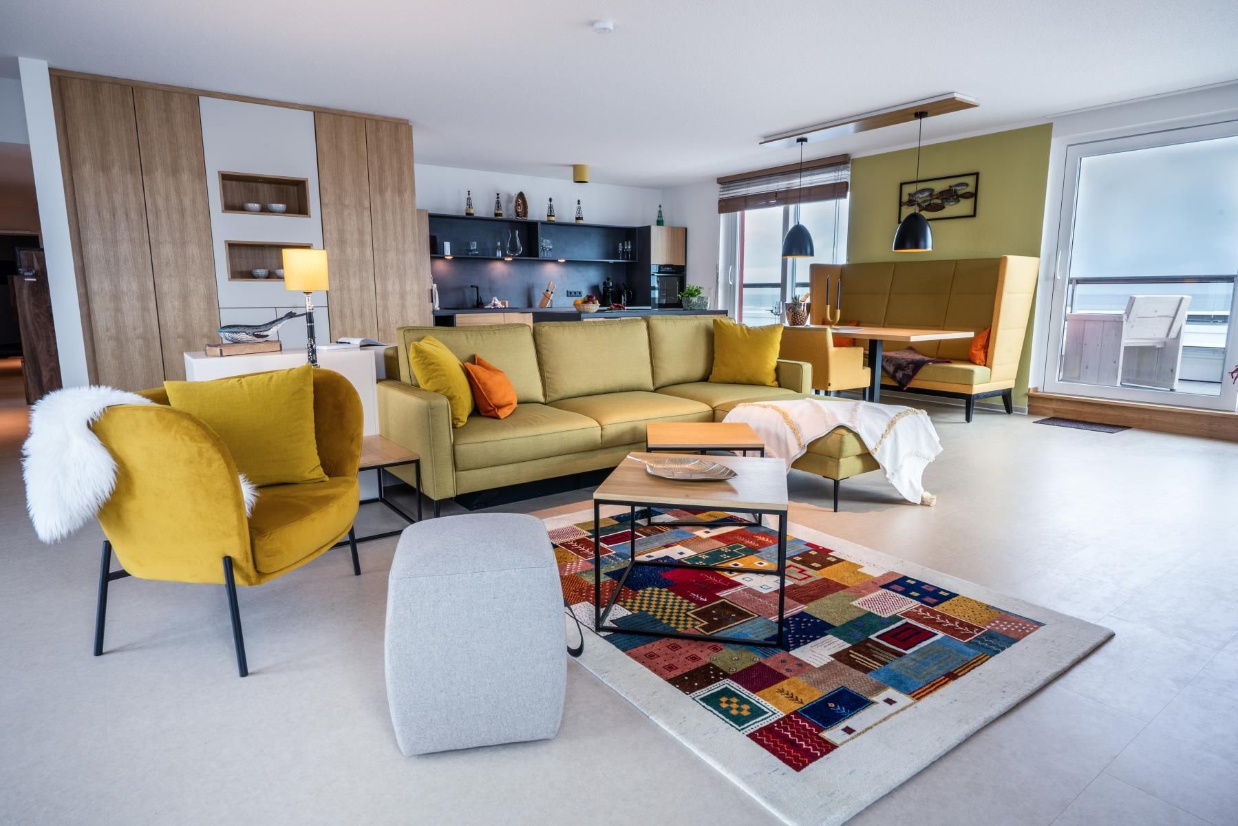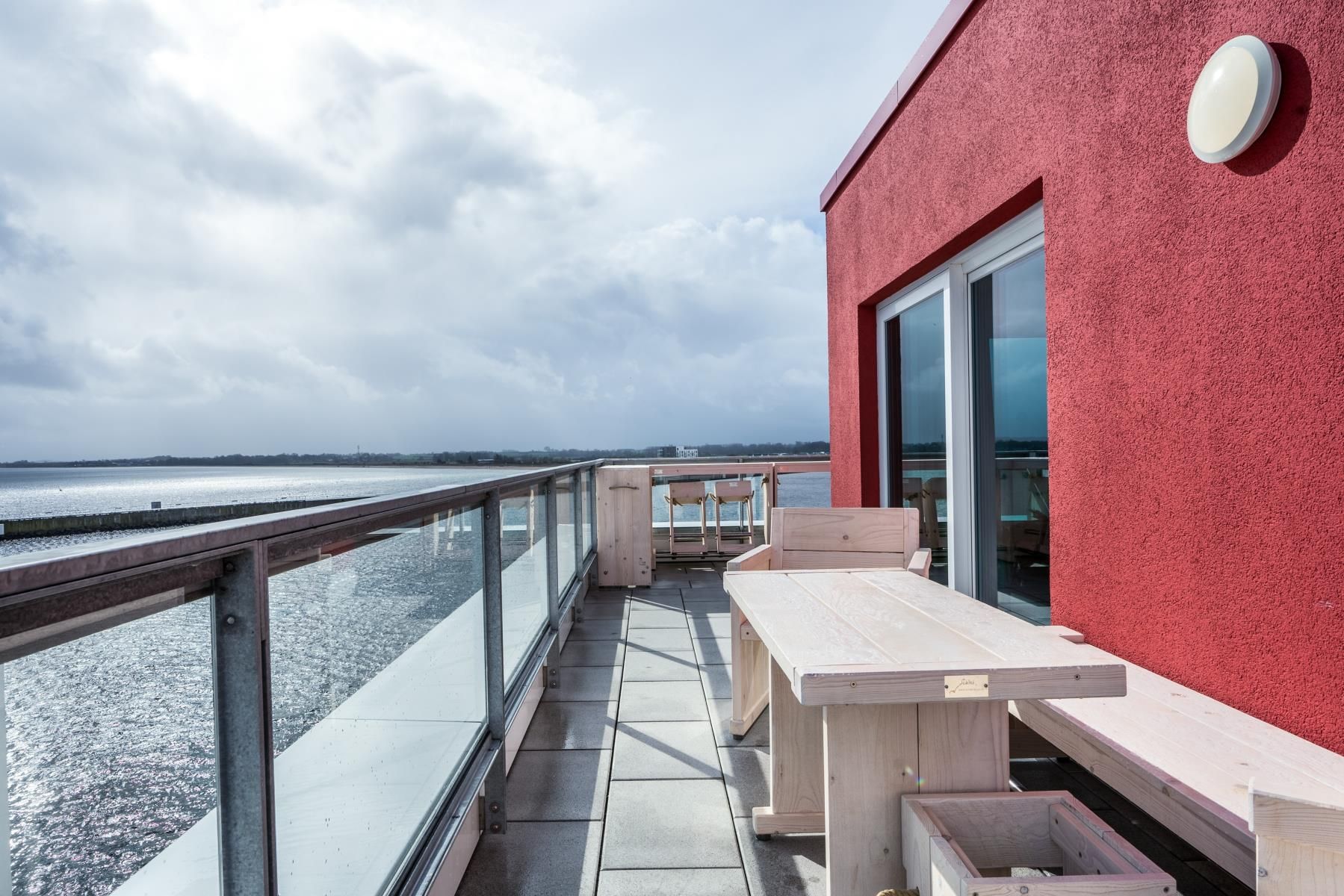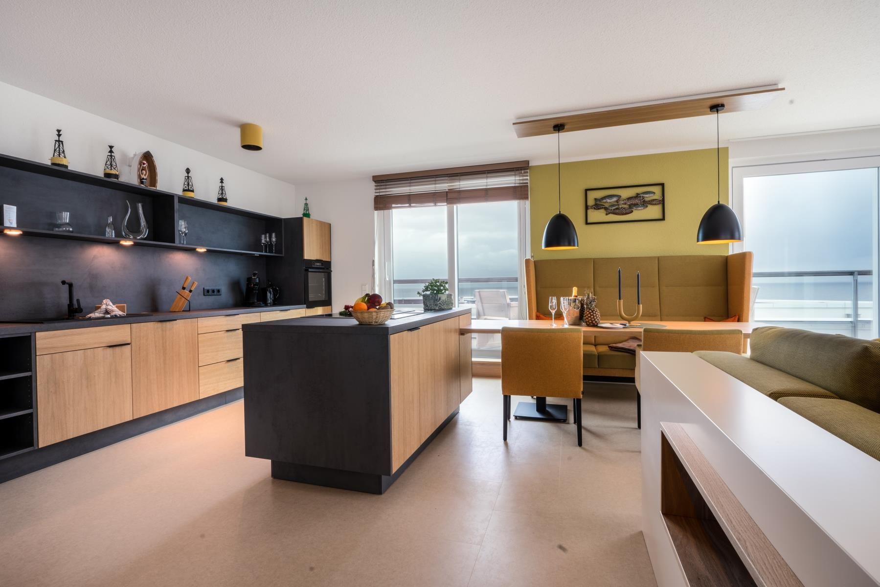 Dieses modern ausgestattete 3-Zimmer-Penthouse bietet großzügigen Raum für bis zu vier Personen auf über 160 m². Es umfasst zwei Schlafzimmer, die jeweils mit Doppelbetten möbliert sind, sowie einen eleganten Wohnbereich mit Sofa und Essbereich. Die voll ausgestattete Küche und das Badezimmer sind sowohl mit einer Dusche als auch mit einem WC ausgestattet, zusätzlich steht ein separates Gäste-WC zur Verfügung. Weiterhin gehört ein Abstellraum zur Wohnung, ebenso wie eine beeindruckende Dachterrasse mit Wasserblick und eine eigene Sauna. Der Unterkunft ist ein Stellplatz in der Tiefgarage für Ihr Fahrzeug zugeordnet. Sollten Sie mit mehreren Fahrzeugen anreisen, besteht die Möglichkeit, gegen eine tägliche Gebühr von 10 € einen weiteren Parkplatz vor dem Gebäude zu reservieren. Für Elektrofahrzeuge stehen ebenfalls Ladesäulen gegen Gebühr bereit.