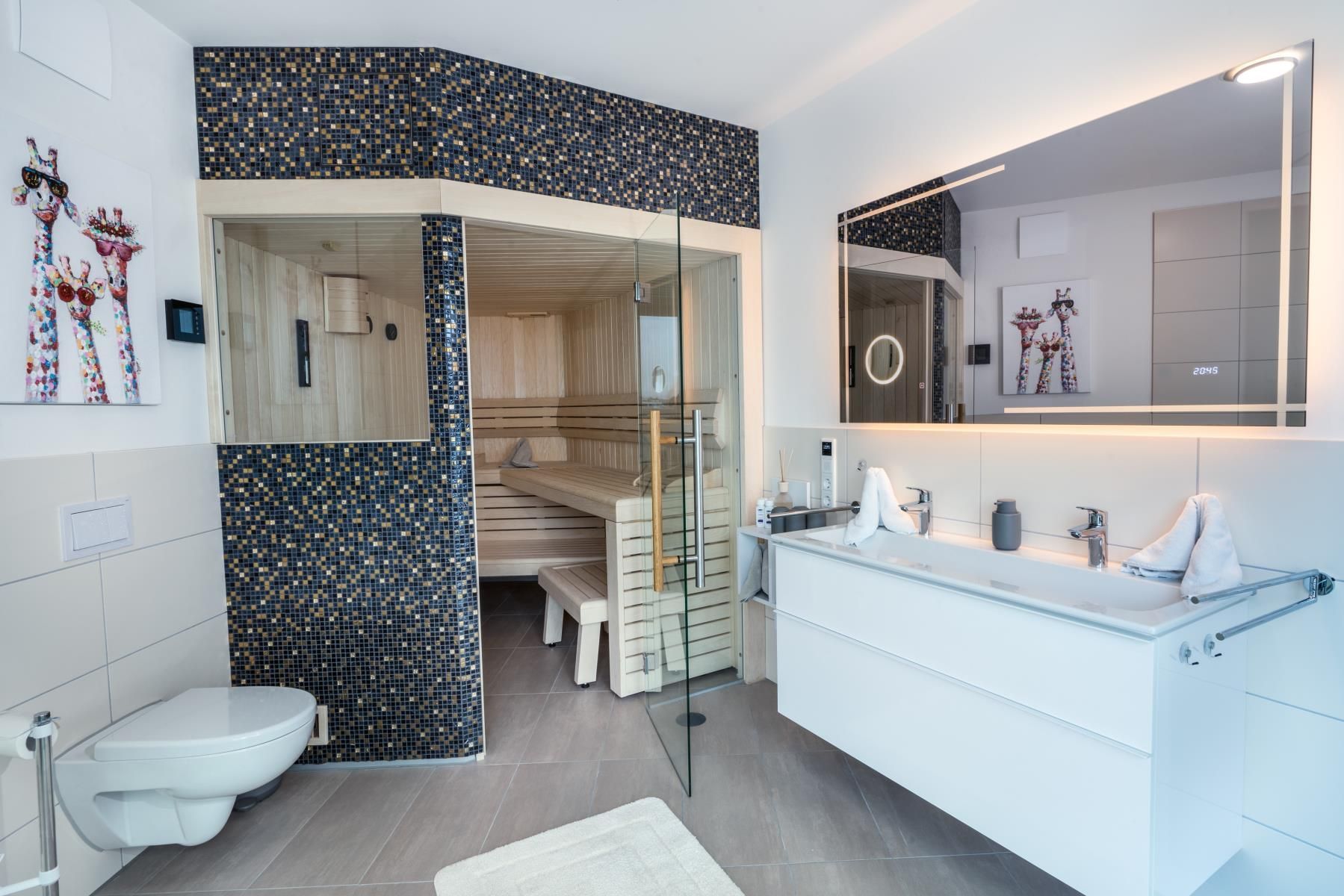 Luxuriöses 3-Zimmer-Penthouse für bis zu 4 Personen, mit einer großzügigen Fläche von über 160 m². Es umfasst zwei Schlafzimmer, ausgestattet mit Doppelbetten, sowie einen geräumigen Wohnbereich mit Couch und einem separaten Essplatz. Der vollständig eingerichtete Küchenbereich verfügt über einen Geschirrspüler. Das Badezimmer ist mit einer Dusche und einem WC ausgestattet, zusätzlich steht ein separates Gäste-WC zur Verfügung. Des Weiteren beinhaltet die Unterkunft eine private Sauna, einen Gaskaminofen sowie einen Hauswirtschaftsraum mit Waschmaschine und Trockner. Eine großzügige Dachterrasse bietet einen atemberaubenden Panoramablick auf den See.